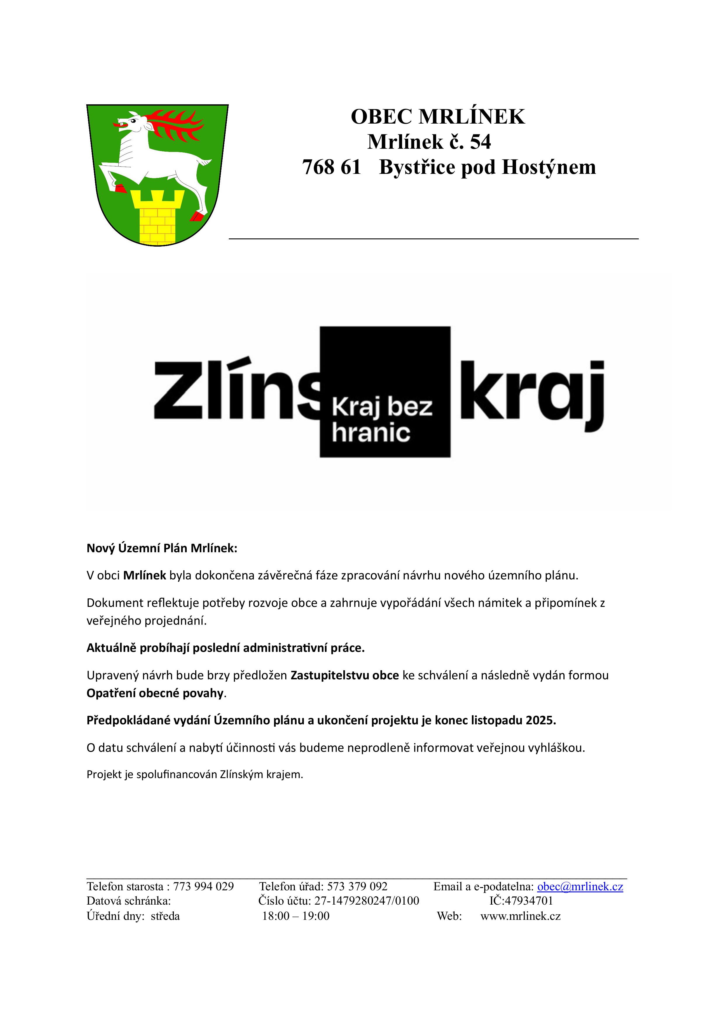 Publicita "DOTACE ZK" - „Zpracování návrhu územního plánu obce Mrlínek“