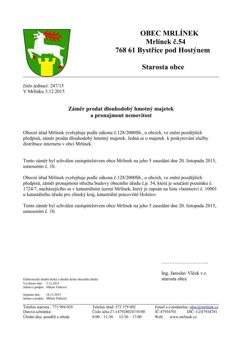 Zveřejnil (zodpovídá): Starosta
