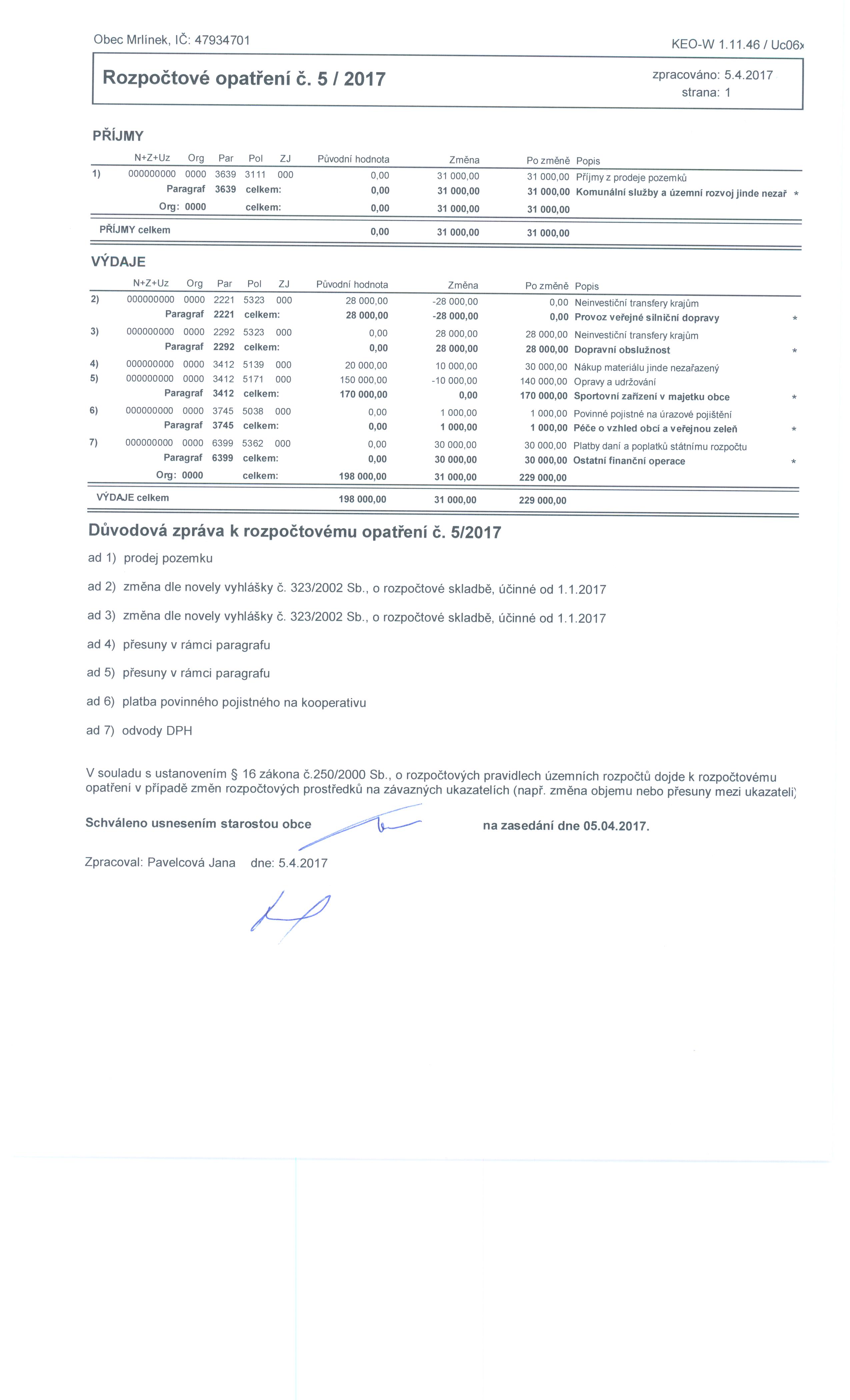 Rozpočtové opatření číslo 5