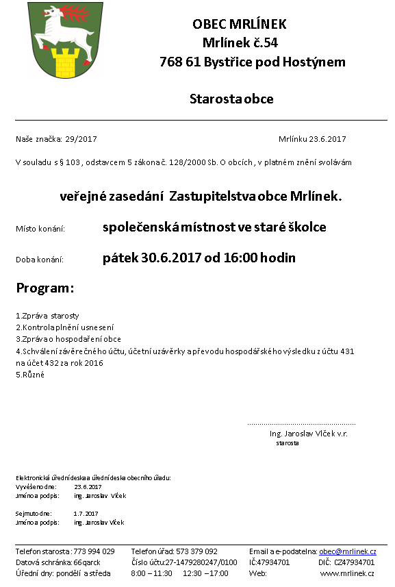 Pozvánka na zasedání ZO dne 30.6.2017