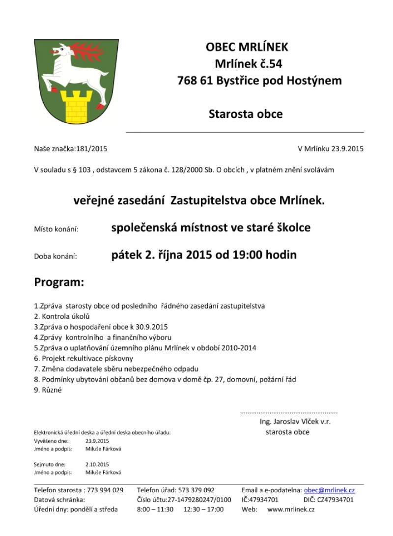 Pozvánka na 4. zasedání ZO 2.10.2015