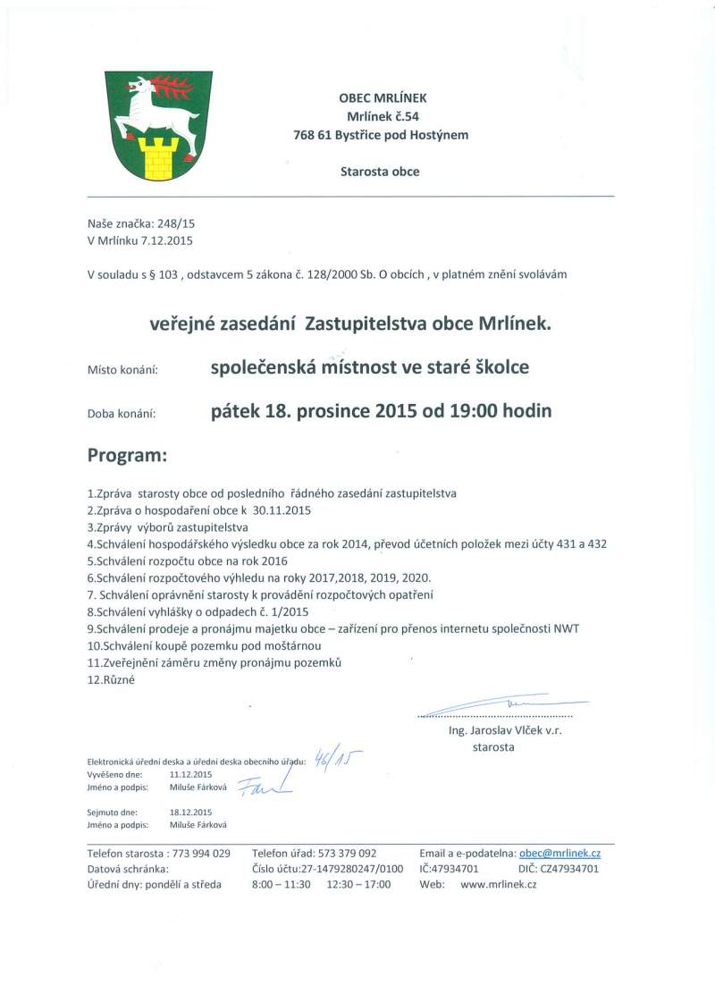 Pozvánka na 6. zasedání ZO 18.12.2015