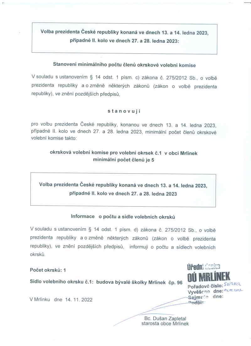 VOLBA PREZIDENTA 2023 -stanovení min. počtu členů OVK, Informace o počtu a sídle