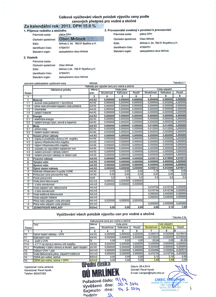 Celkové vyúčtování všech položek výpočtu ceny podle cenových předpisů pro stočné pro kalendářní rok 2013