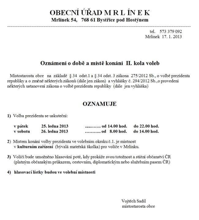 Oznámení o době a místě konání 2.kola prezidentských voleb