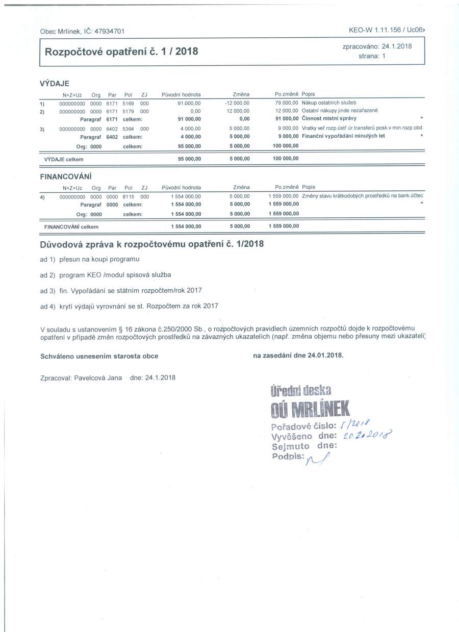 Rozpočtové opatření Č. 1/2018