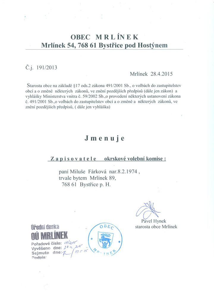 Nové KOMUNÁLNÍ VOLBY-jmenování zapisovatele