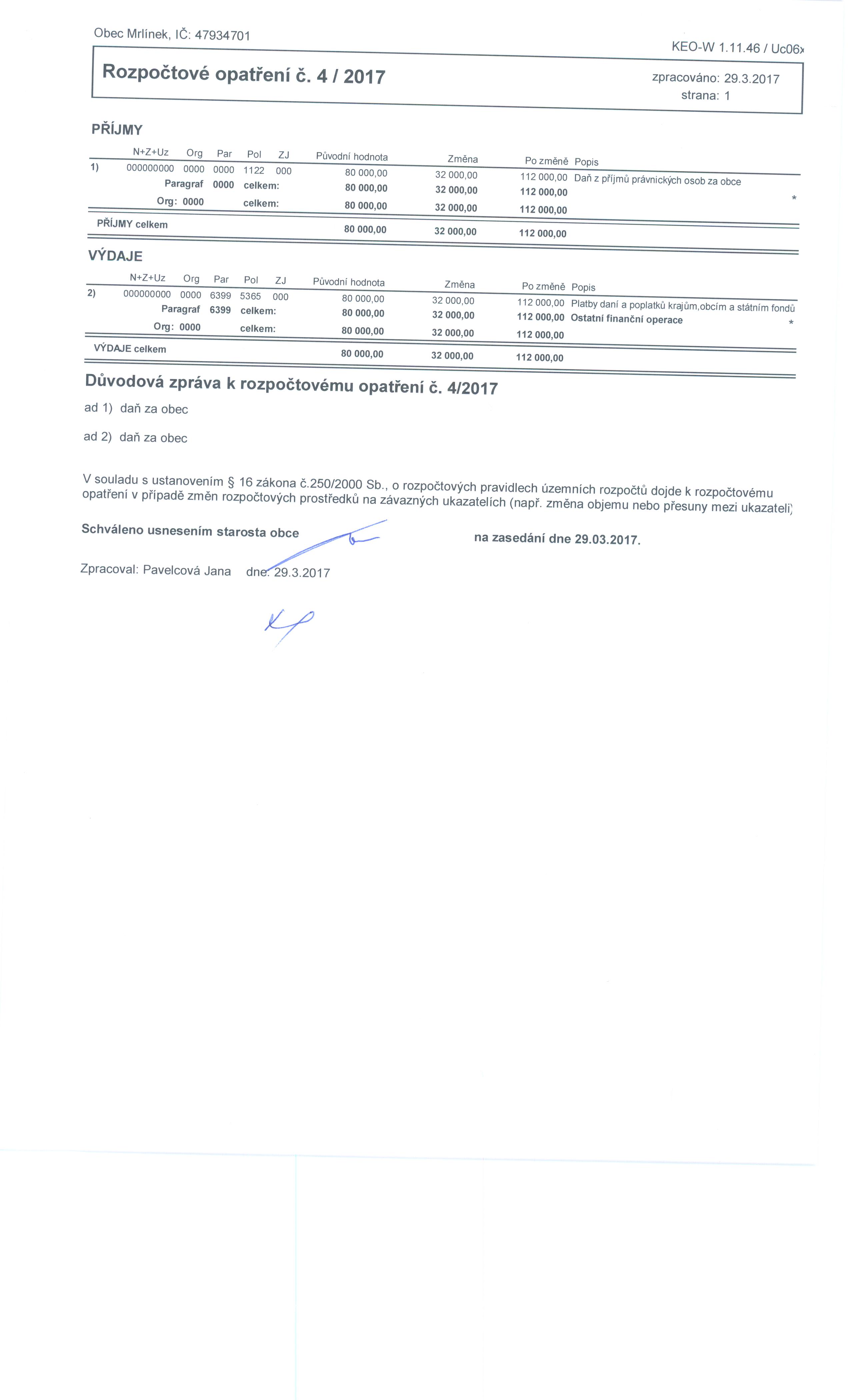 Rozpočtové opatření číslo 4